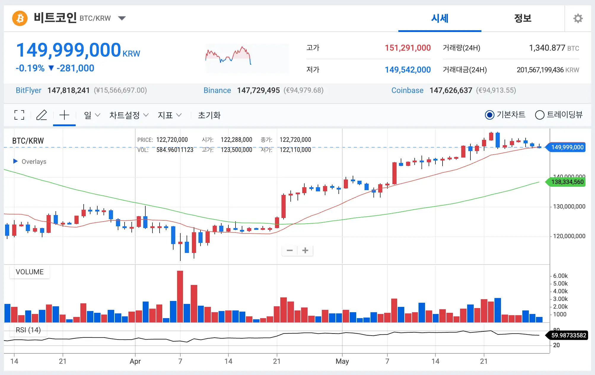 최근 최고가 154,861,000원을 달성한 후 약 3% 하락한 수치입니다.