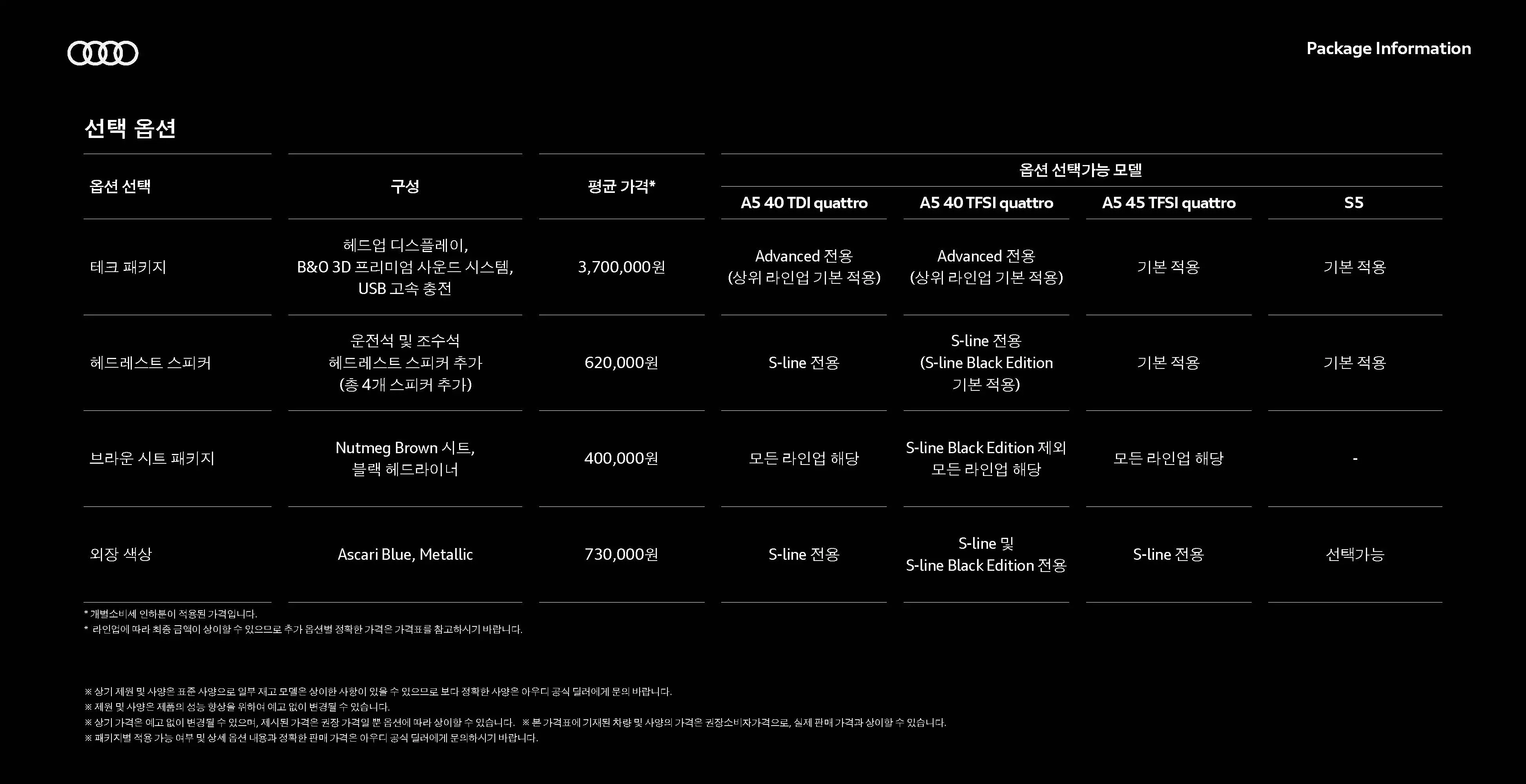 아우디 차량은 그동안 정해진 옵션만 구매할 수 있었는데요, 테크 패키지, 헤드레스트 스피커, 브라운 시트 패키지 등을 선택할 수 있게 되었습니다.