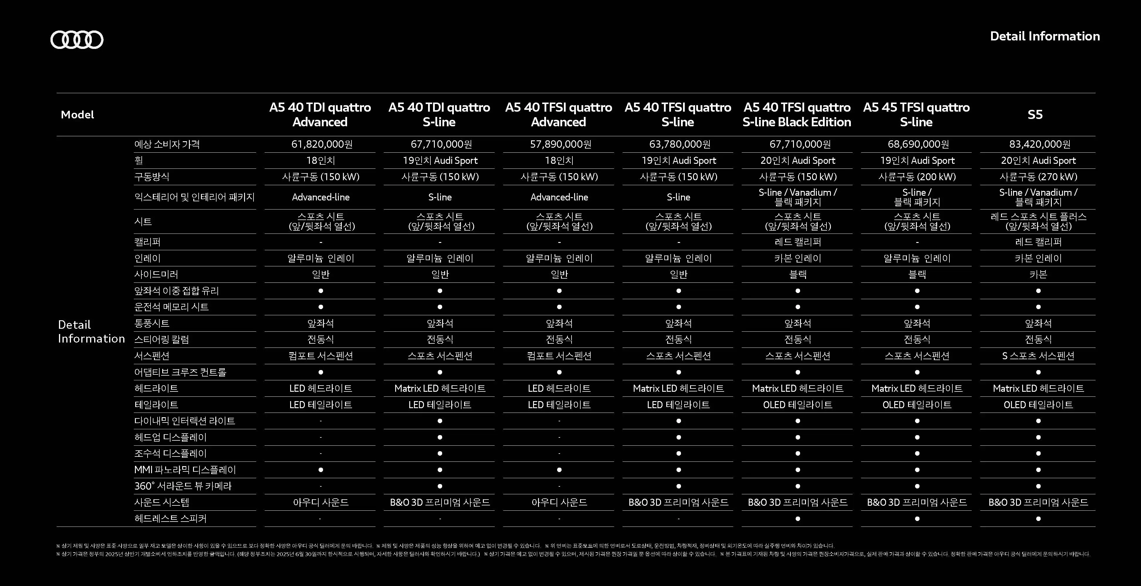 | A5 40 TFSI quattro S-line | 63,780,000원 | 가솔린 204PS | 10.8 km/L | Advanced 모델 기본 + Matrix LED, 다이내믹 라이트, 360° 카메라, 헤드업 디스플레이, 스포츠 서스펜션 등 |