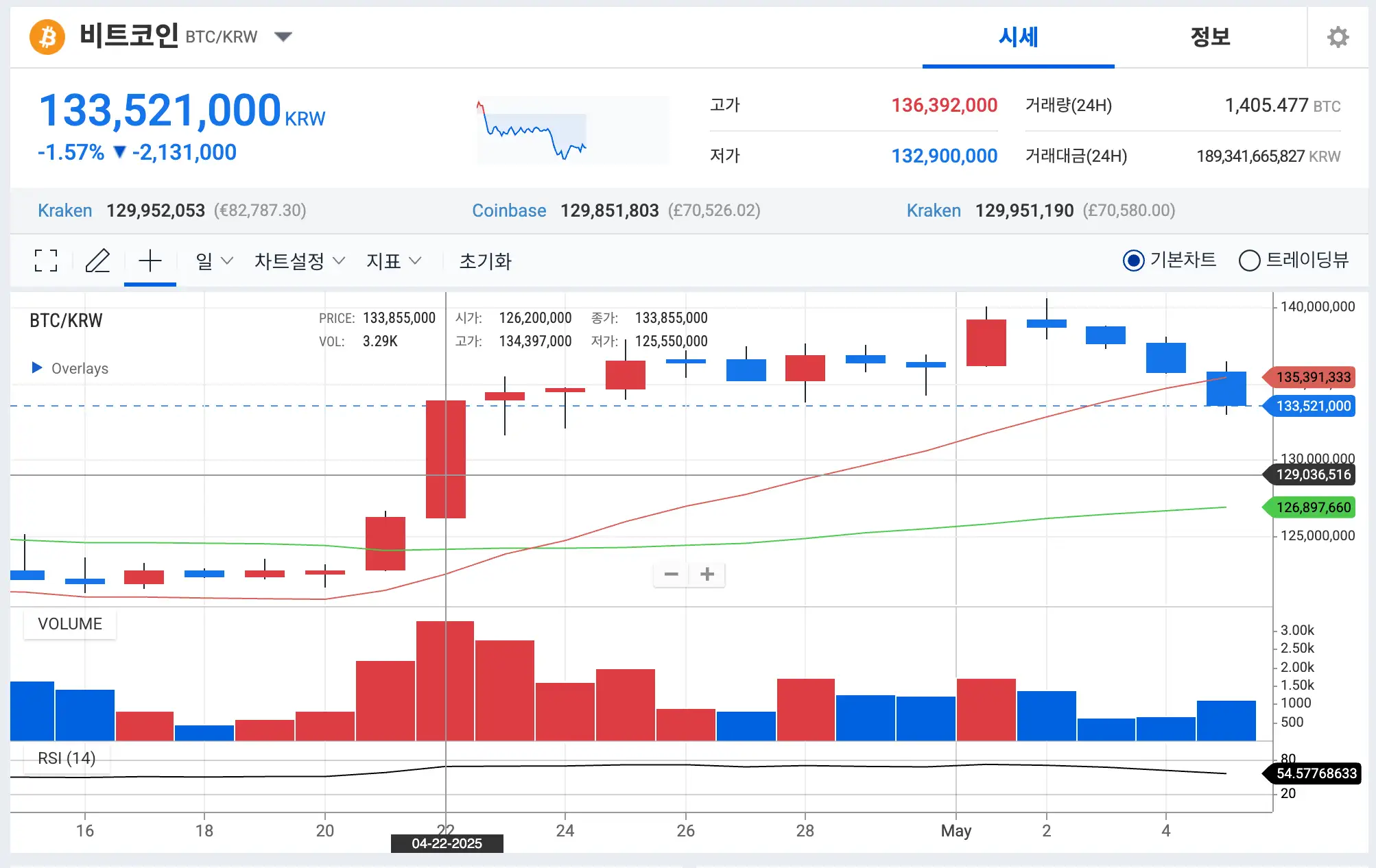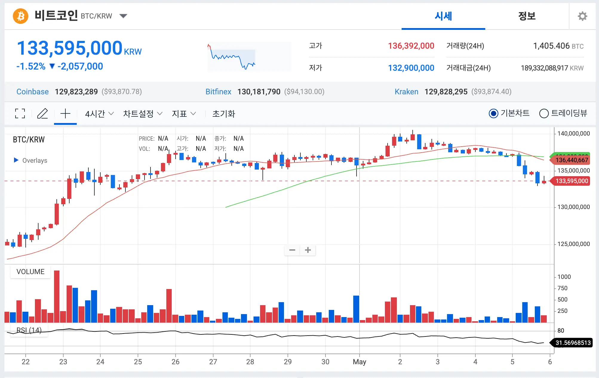 비트코인은 1월 22일, 1억 2천 만원선에서 1억 3천 만원선까지 시세를 회복했으며 현재는 1억 3,900만 원에서 거래되다 5월 5일 1.6% 하락한 1억 3,300만 원선에서 거래가 이뤄지고 있습니다.